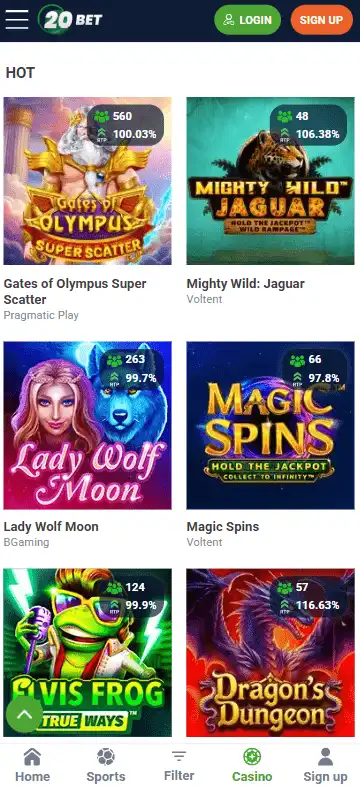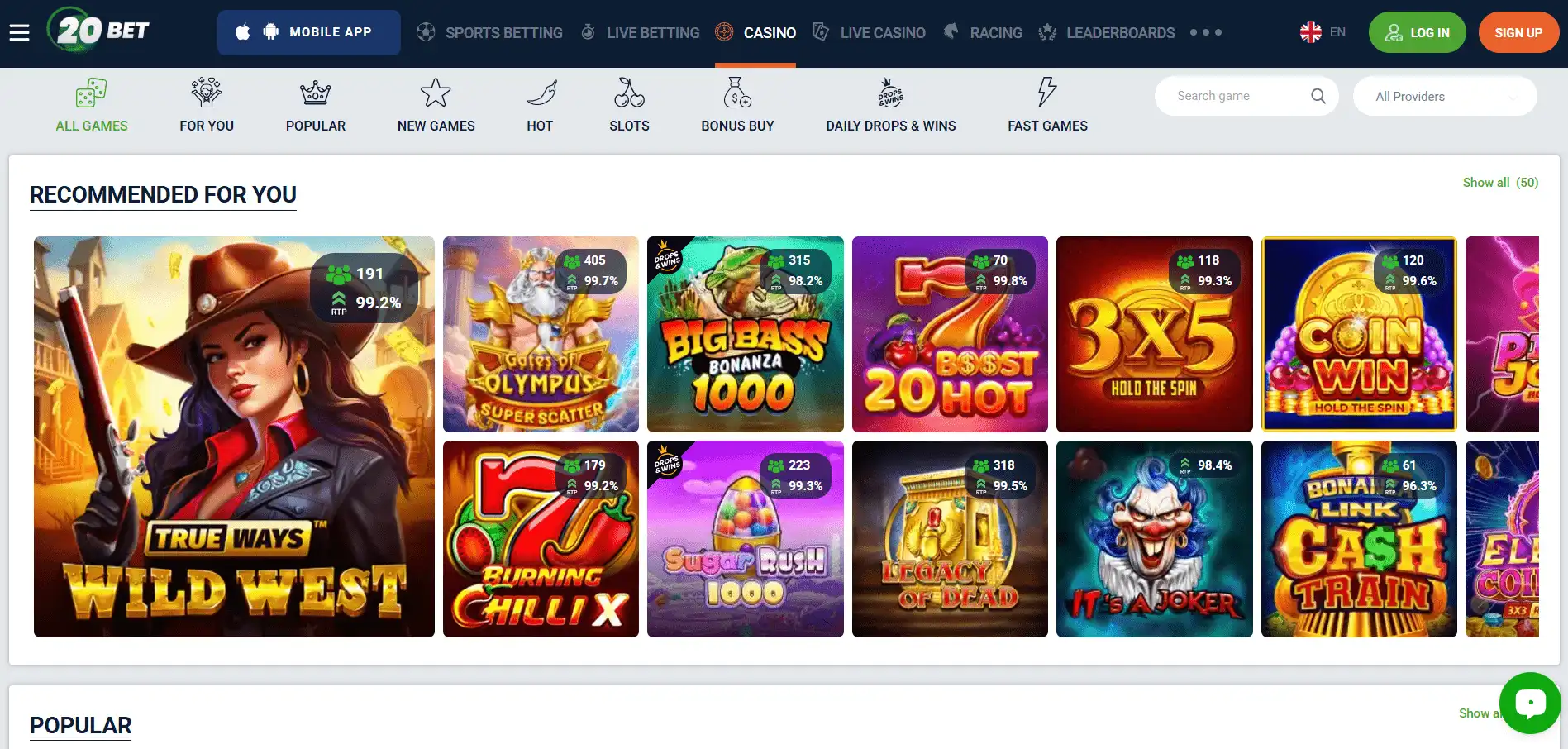 Výběr her v kasinu 20Bet vyniká díky partnerství s více než 40 předními poskytovateli softwaru. Velká jména jako NetEnt, Pragmatic Play, Evolution Gaming, Yggdrasil a Spinomenal dodávají kombinaci nadčasových klasik i moderních novinek. Hráči mohou vyhledávat podle vývojáře a dokonce si vyzkoušet demo verze bez nutnosti vkladu. Díky častému přidávání nových her zůstává platforma aktuální a poutavá, takže při každém přihlášení je vždy co objevovat.