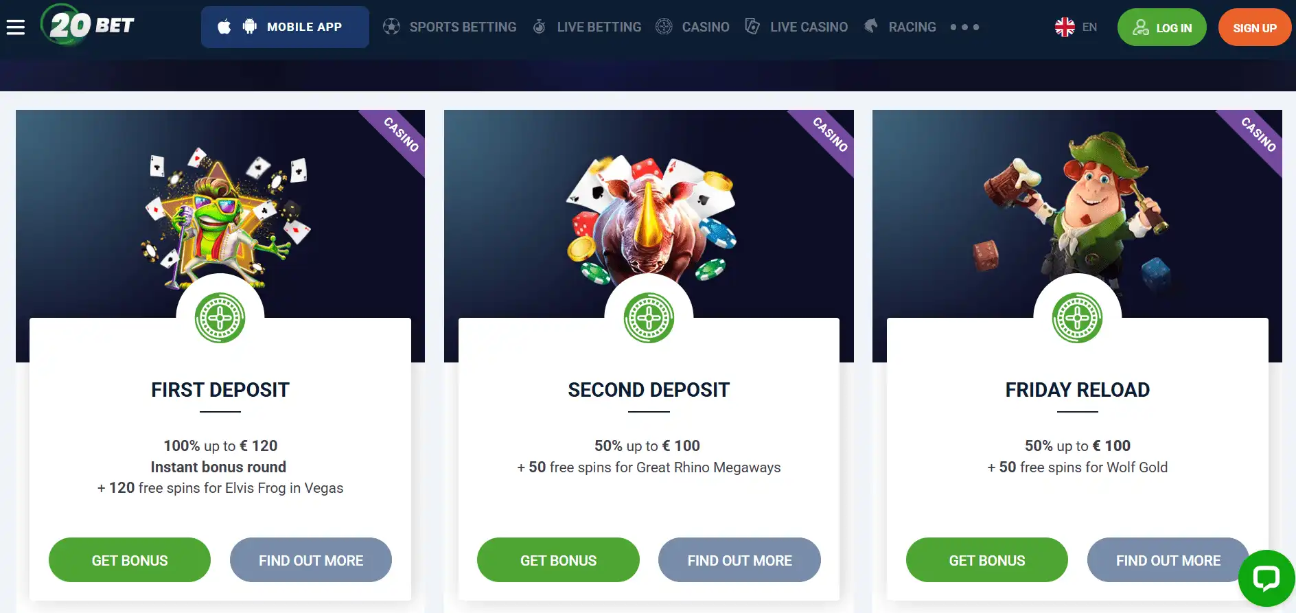V kasinu 20Bet mají noví hráči možnost vybrat si mezi dvěma uvítacími bonusy, přizpůsobenými buď pro kasinové hry, nebo pro sportovní sázení. 20bet kasino uvítací nabídka tak pokrývá různé herní preference.