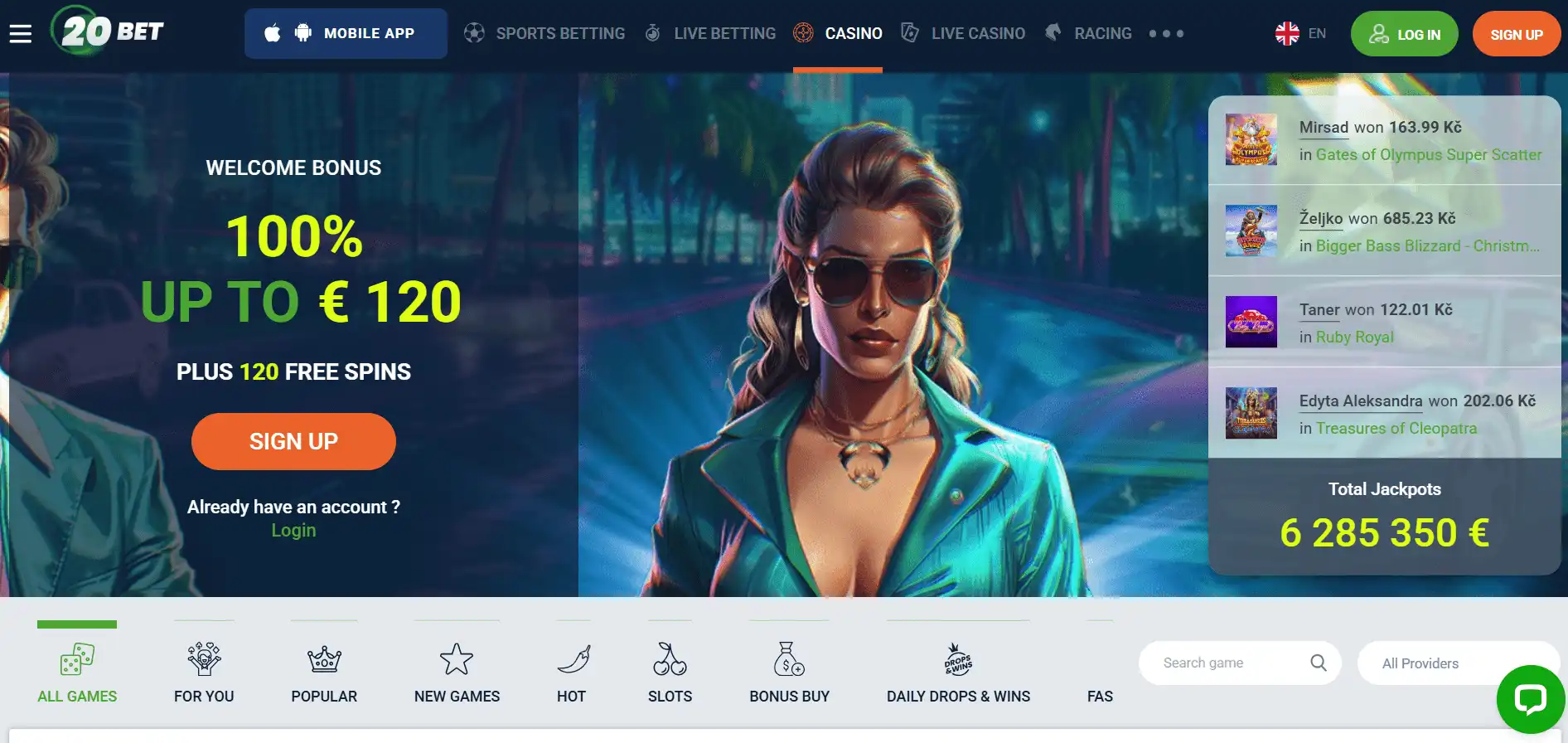 Toto kasino hned na první pohled zapůsobí širokou nabídkou 20bet kasino odměny pro milovníky kasina i sázkaře na sport. Ať už vás baví roztáčet automaty, sázet na fotbal nebo využívat reload bonus, vždy je k dispozici něco zajímavého – není vyžadován žádný 20bet kasino promo kód. Díky týdenním nabídkám a propracovanému VIP programu najdou jak noví, tak i vracející se hráči mnoho příležitostí, jak navýšit svůj bankroll. Níže se podíváme na vše od uvítacích bonusů přes věrnostní odměny až po probíhající turnaje v kasinu 20Bet.