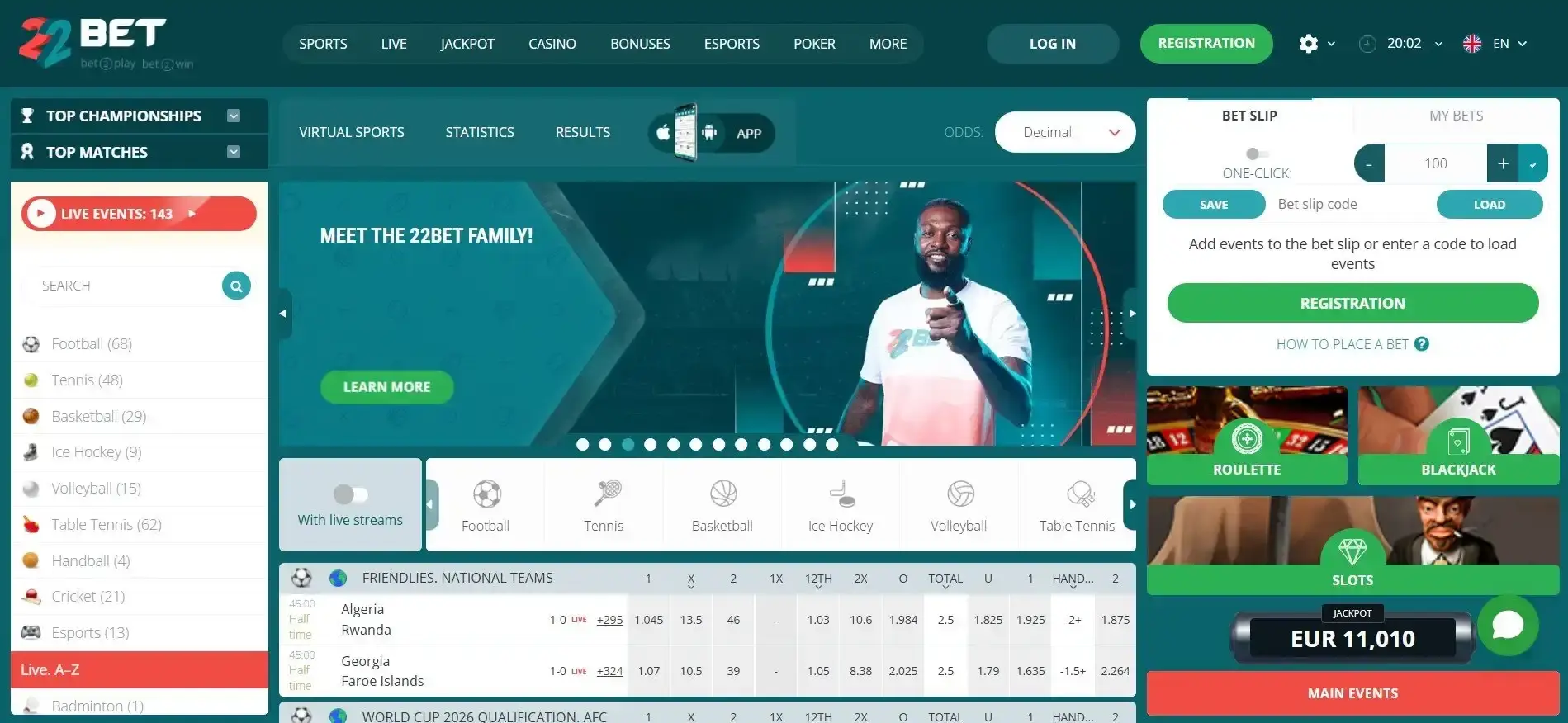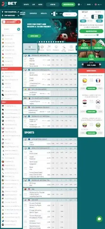 Sportovní sázení je hlavní nabídkou u 22Bet. Sázková kancelář je rozsáhlá a pokrývá široké spektrum globálních událostí ve fotbale, basketbalu, tenisu a mnoha dalších sportech. Zaznamenali jsme také výborné pokrytí esportů s nabídkou sázek na populární tituly jako CS:GO, Dota 2 a League of Legends. Rozhraní je přehledné a podporuje jak předzápasové, tak živé sázení pro maximální flexibilitu.