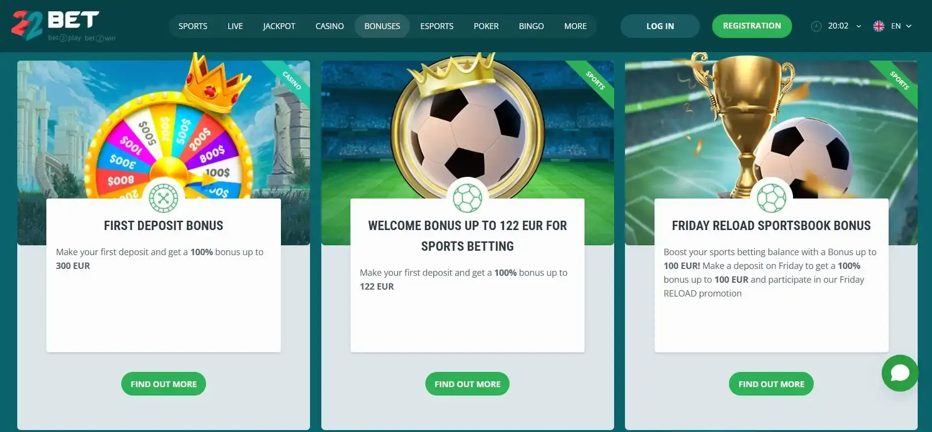 Hráči si mohou užívat 22Bet kasino odměny téměř každý den, od vkladových bonusů až po věrnostní benefity. Požadavek na minimální vklad závisí na konkrétní nabídce, obvykle se pohybuje mezi 1 € a 20 €. Podmínky prosázení se liší podle 22bet kasino bonus: uvítací bonus vyžaduje 50x, týdenní bonusy 40x a free spiny z turnajů 25x. Všechny 22Bet kasino bonusy musí být využity do 7 dnů a jsou automaticky připsány, pokud se nerozhodnete je odmítnout. Je důležité poznamenat, že většina promoakcí není dostupná pro vklady v kryptoměnách.