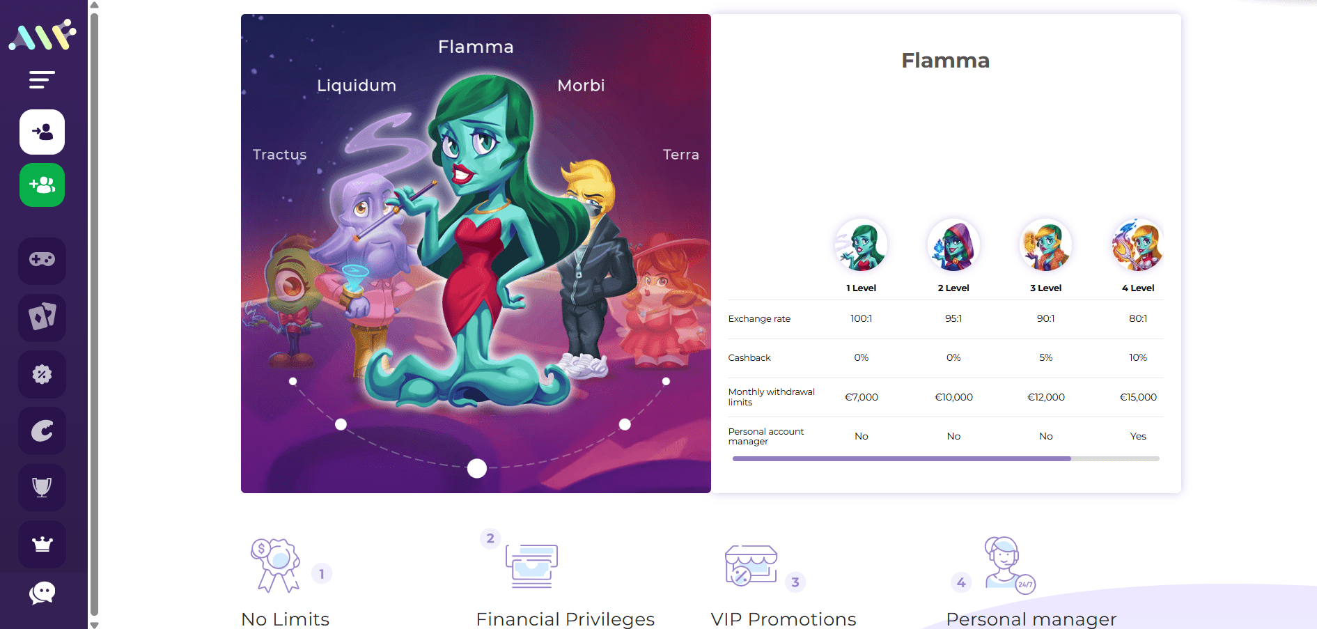 Věrnostní program Alf Casino je rozdělen do pěti úrovní: Flamma, Tractus, Liquidum, Morbi a Terra. Jakmile čeští hráči postupují výš, odemykají lepší výhody, mezi které patří cashback až 10 %, výhodnější převod bodů (až na poměr 80:1) a zvýšené měsíční limity pro výběr, které rostou ze 7,000 € až na 15,000 €. Členové vyšších úrovní navíc získávají osobního manažera účtu a exkluzivní VIP nabídky přizpůsobené jejich hernímu stylu. Tento věrnostní program lze vnímat také jako speciální formu Alf kasino bonus, která odměňuje dlouhodobou aktivitu hráčů.