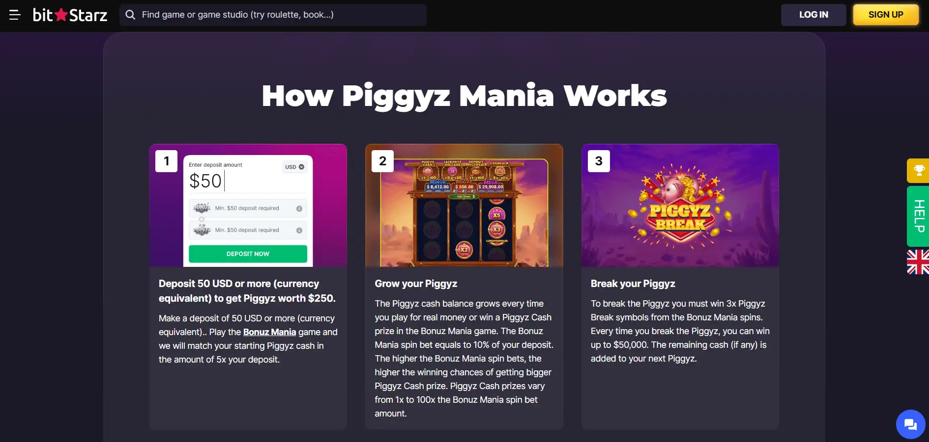- Piggyz Mania – Vklad 50 $ nebo více uděluje Piggyz Cash začínající na 5násobku vkladu. Zůstatky rostou s hraním a mohou dosáhnout až 50 000 $. Rozbití prasátka vyžaduje zasažení speciálních symbolů během spinů v Bonuz Mania.