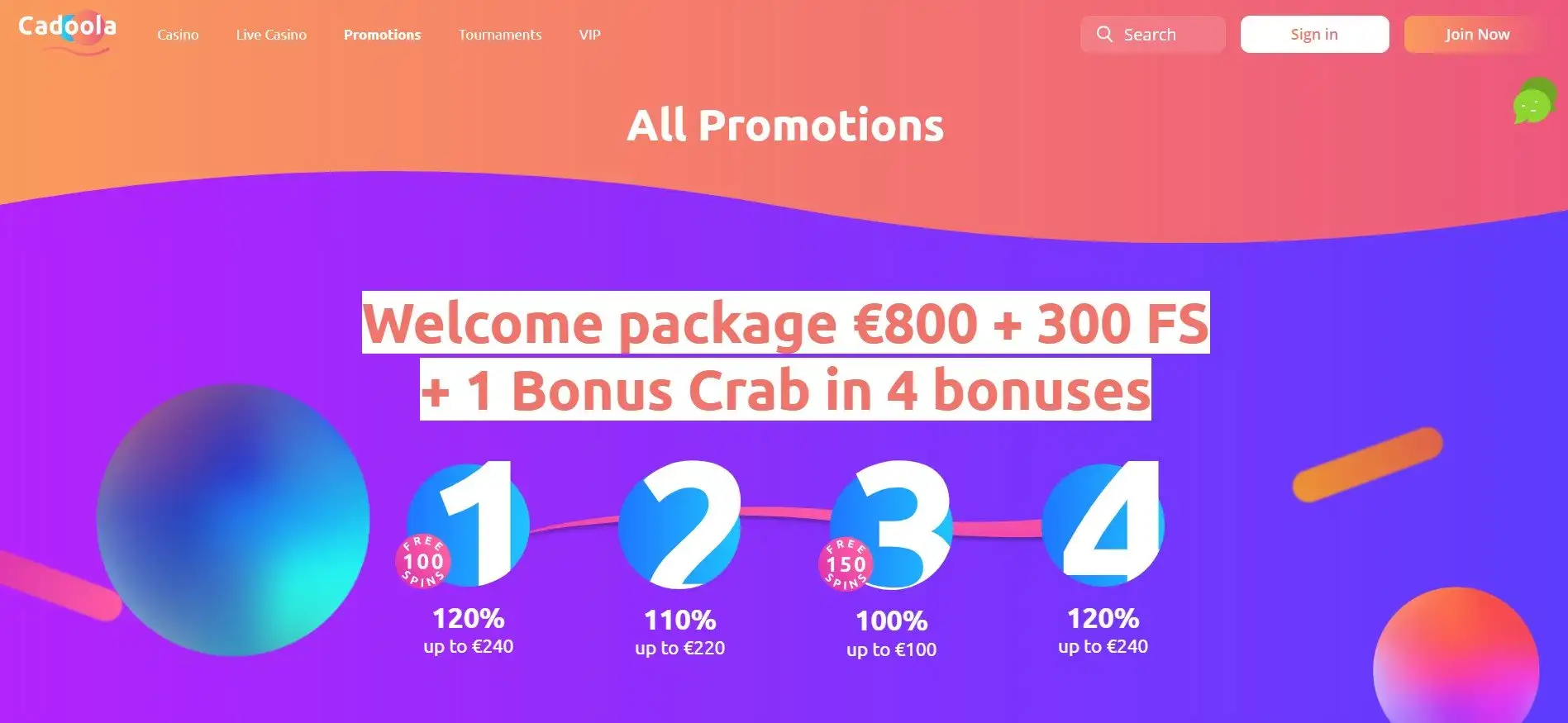 Cadoola kasino uvítací nabídka je rozdělena do čtyř vkladů a nabízí až 800 € celkem, spolu s 300 volnými zatočeními a 1 Bonus Crabem. Zde je rozpis:
