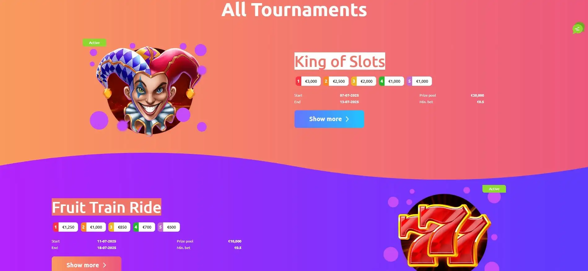 - Fruit Train Ride – prize pool 10 000 €, minimální sázka 0,5 € (končí 18-07-2025).
