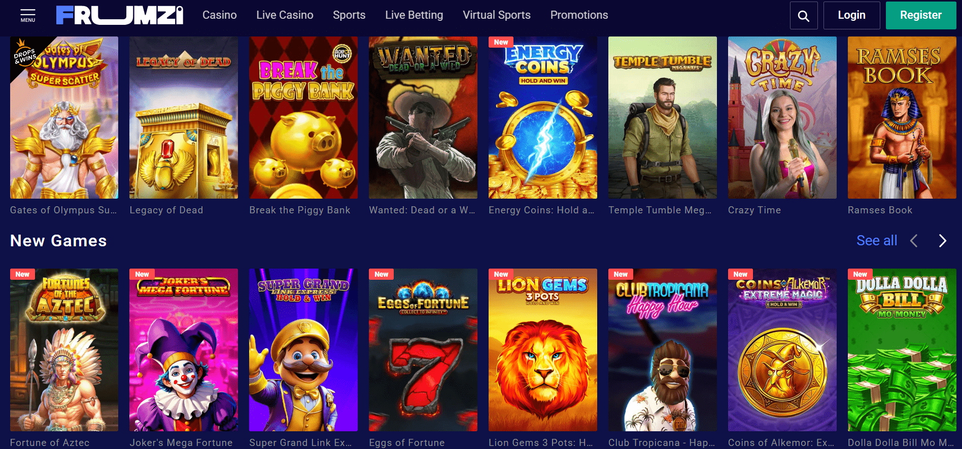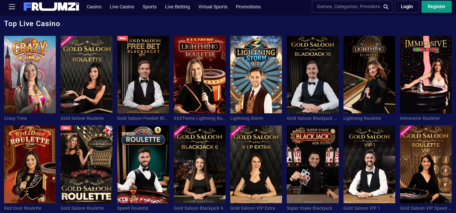 Frumzi Casino spolupracuje s některými z nejvýznamnějších jmen v iGaming průmyslu. Čeští hráči si mohou užít tituly od NetEnt, Play’n GO, Evolution, Pragmatic Play, Quickspin, Yggdrasil a několika dalších. Tito vývojáři jsou známí tím, že nabízejí špičkové hry s férovým RTP, plynulou mechanikou a působivou vizuální stránkou. Díky této kombinaci poskytuje Frumzi kasino online kasino nepřetržitý proud novinek i osvědčených klasik, od výherních automatů až po stoly se živými dealery.