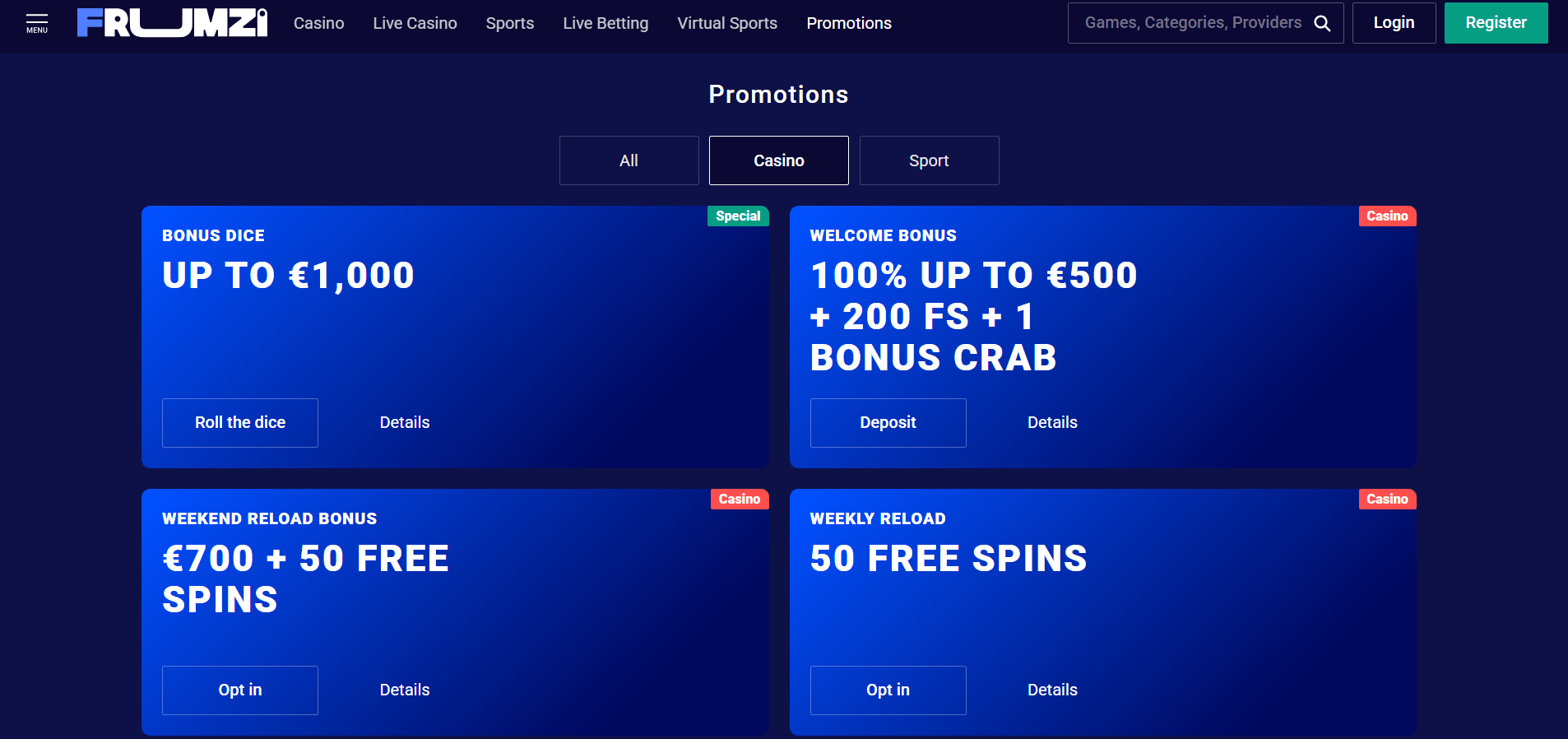Frumzi Casino nabízí časté akce, mezi které patří: