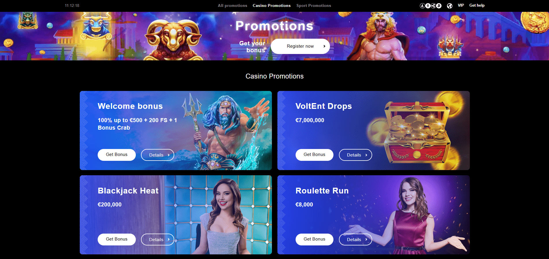 Noví hráči jsou přivítáni se 100% bonusem až do 500 € + 200 volnými zatočeními + 1 Bonus Crab. Pro aktivaci této nabídky: