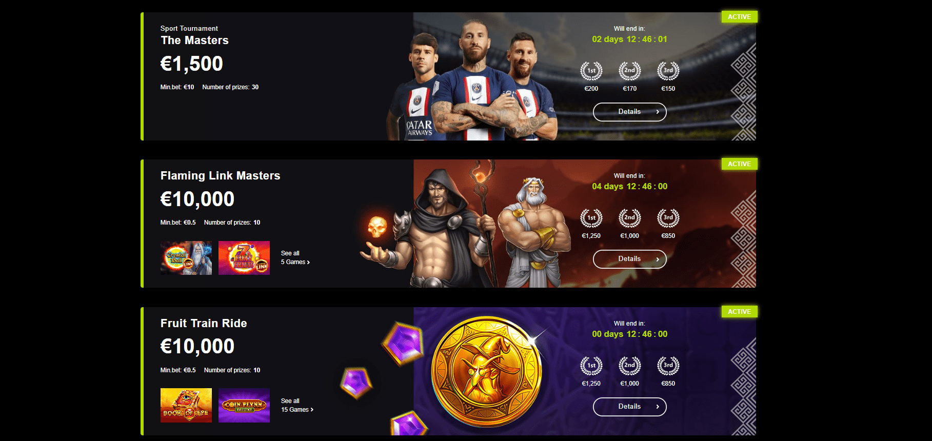 - Turnaje na automatech (např. Fruit Train Ride s prize poolem 10 000 €)