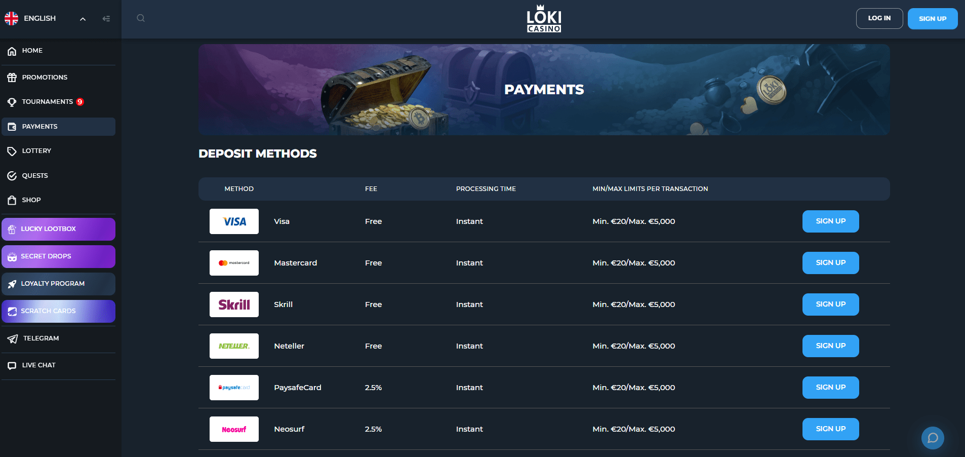 Čeští hráči si mohou v Loki Casino vybírat z více než 30 možností pro vklady a výběry. K dispozici jsou například Visa, Mastercard, Skrill, Neteller, EcoPayz, Paysafecard nebo MuchBetter. Fanoušci kryptoměn mají přístup k Bitcoinu, Ethereu, Litecoinu, USDT, Dogecoinu a dalším.