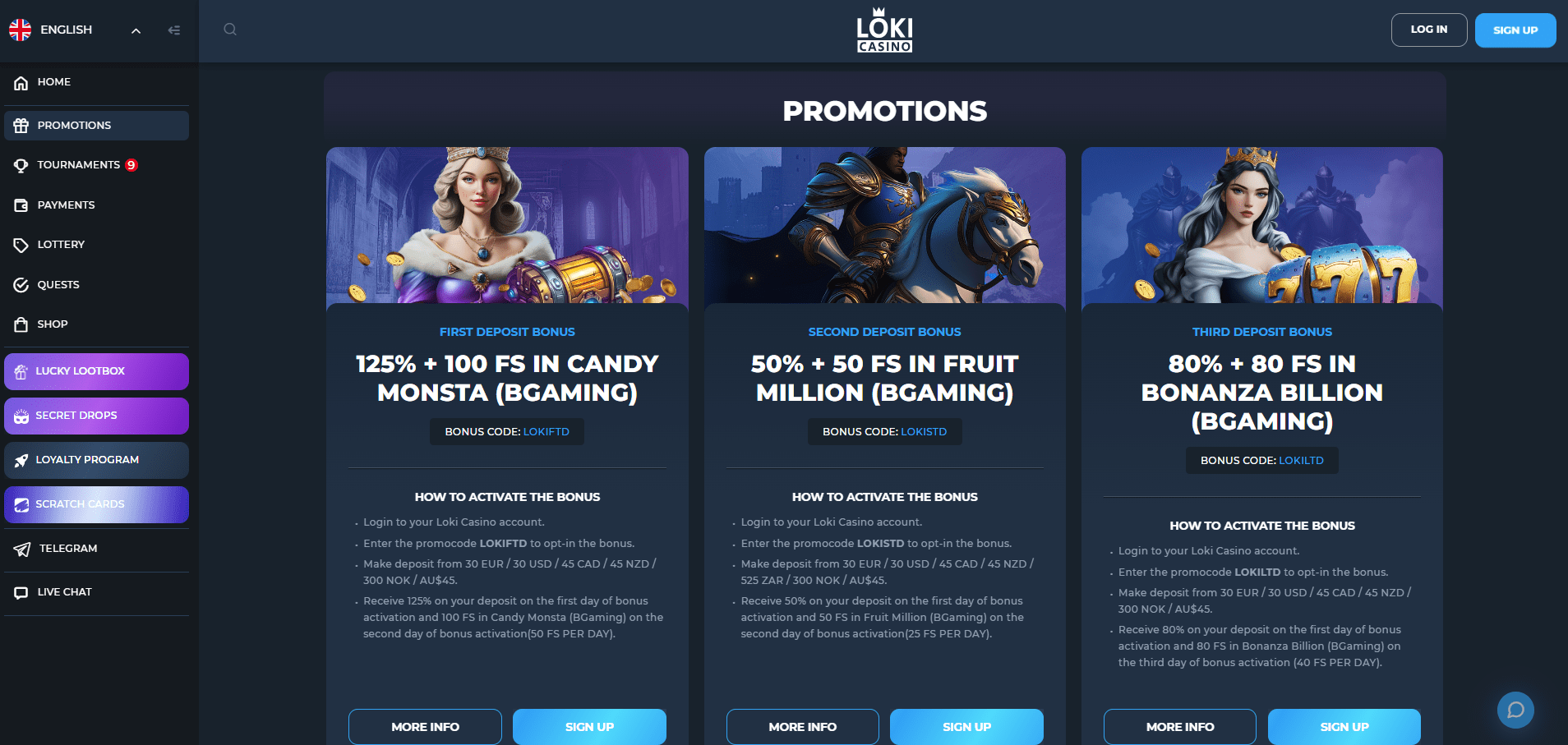 Loki oslovuje ty, kteří mají rádi velké uvítací balíčky, pravidelné promoakce a rozsáhlou knihovnu automatů i živých her.