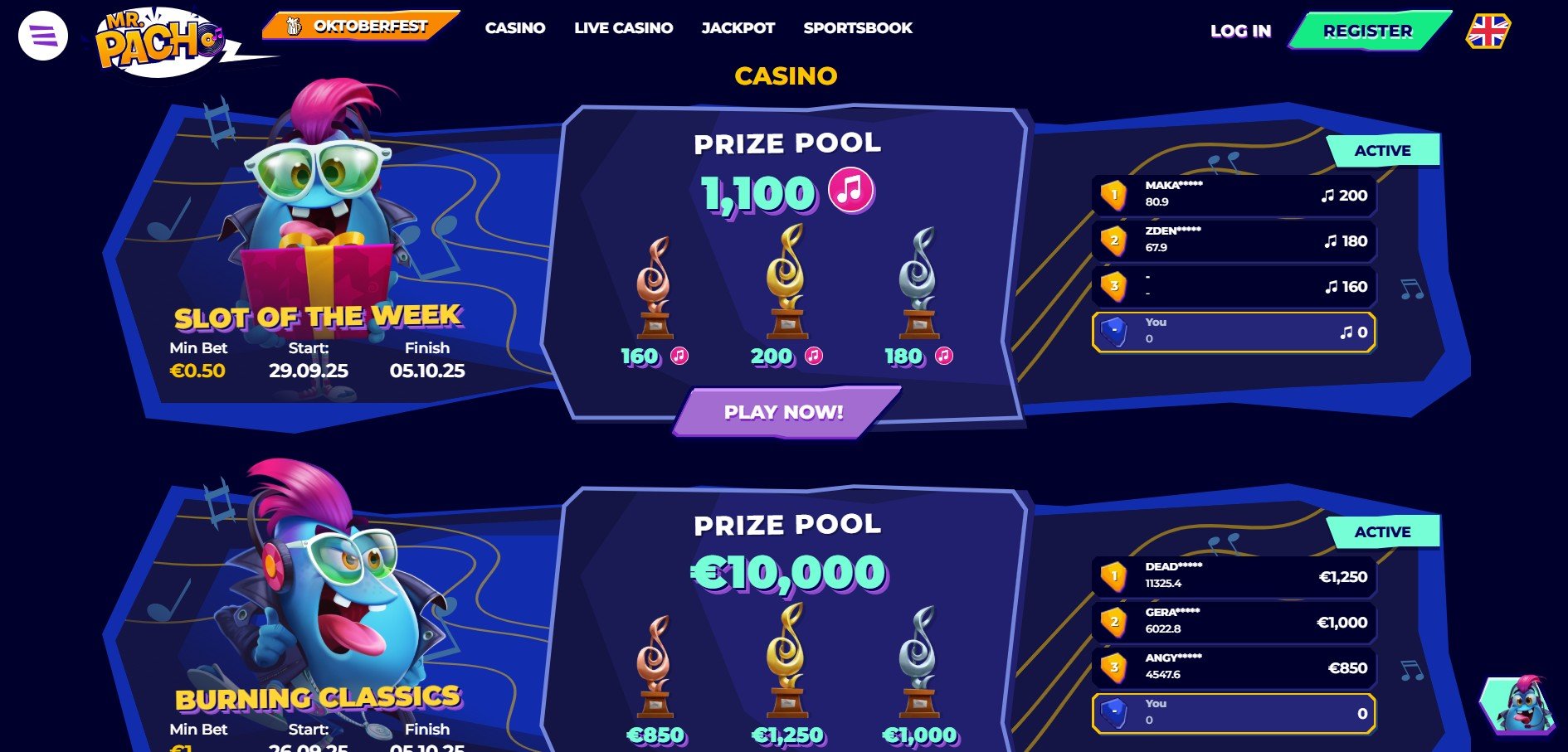 Turnaje patří mezi hlavní lákadla v Mr Pacho. Kasino pravidelně pořádá soutěže na automatech i v live hrách s atraktivními prize pooly. Hraním vybraných titulů získáváte body, díky nimž stoupáte na žebříčku a získáváte ceny. Součástí akcí bývá i možnost využít speciální nabídky, kde se uplatňuje MrPacho kasino promo kód.
