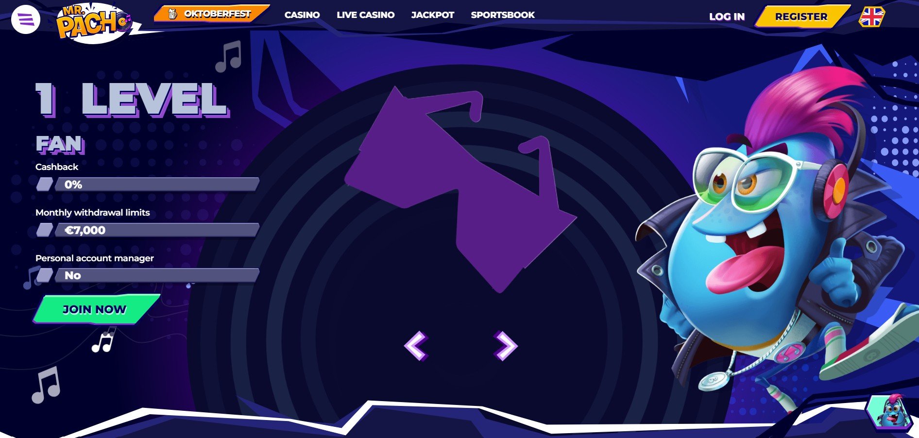 Mr Pacho Casino uplatňuje limity 500 € na den a 7,000 € měsíčně pro běžné členy. Jakmile ale hráči dosáhnou vyšších VIP úrovní, otevřou se jim mnohem vyšší možnosti. V závislosti na dosaženém VIP statusu mohou měsíční limity pro výběr v MrPacho kasino online kasino vzrůst až na 75,000 €, což poskytuje výrazně větší flexibilitu pro high rollery i časté hráče.