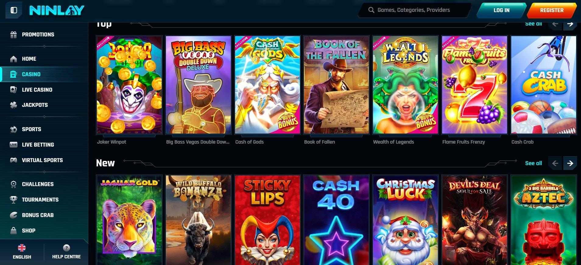 Ninlay automaty dominují numericky s reprezentací top developerů. Vybrané tituly jako Book of Fallen, Wild Trigger, Spinango, Eye of Atum, Cash Gods a Wealth of Legends exemplifikují kvalitu. Kasino pravidelně aktualizuje katalog novými releasy zachovávajícími svěžest nabídky.