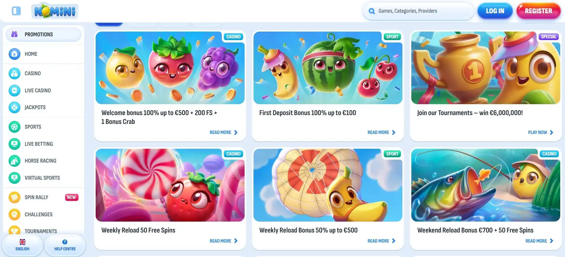 Jakmile si hráči nárokují uvítací bonus, Nomini udržuje napětí díky široké nabídce akcí napříč kasinovými hrami, stoly s živými dealery a sportovním sázením. Nomini kasino promoakce zahrnují: