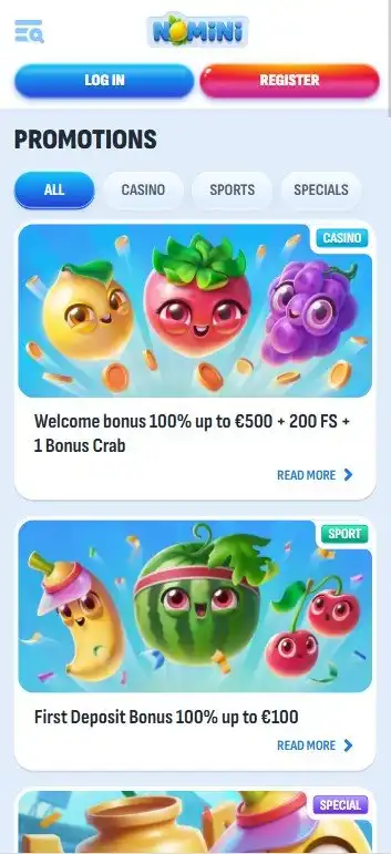 Noví hráči v Česku mohou začít silně díky nabídce 100% bonusu až do výše 500 €, 200 volným zatočením a 1 Bonus Crabem. Nomini kasino uvítací nabídka patří mezi nejštědřejší balíčky dostupné českým hráčům.