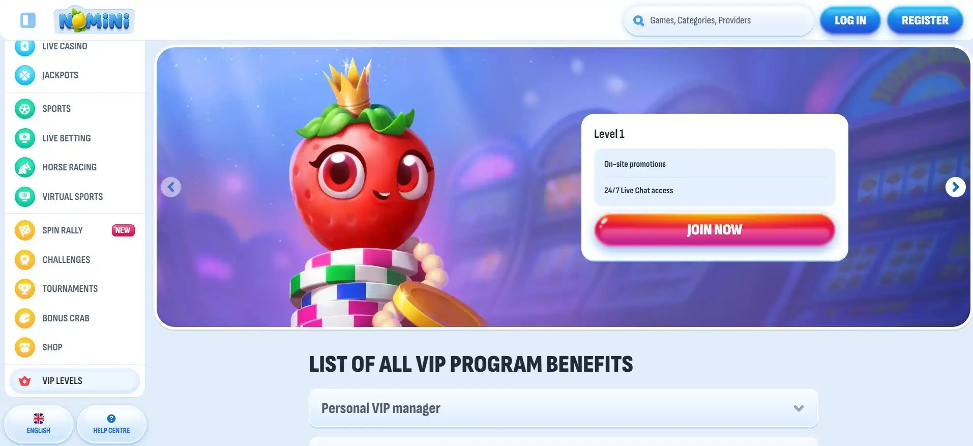 Nomini Casino provozuje pětistupňový VIP program, který odměňuje loajální české hráče postupně lepšími výhodami. Postup na vyšší úroveň závisí na pravidelném hraní a sázení, přičemž každý krok odemyká nové benefity.