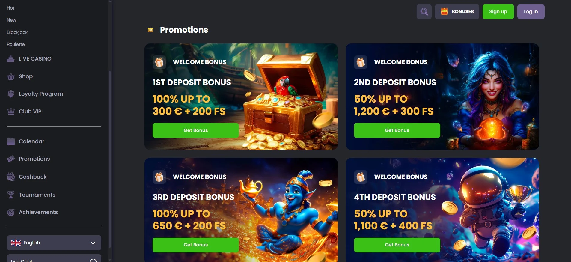 Kasino vítá jak začátečníky, tak zkušené hráče. Jeho víceúrovňový uvítací balíček osloví nováčky, zatímco VIP program a bonusy pro high rollery vyhoví zkušeným hráčům, kteří hledají vyšší odměny.