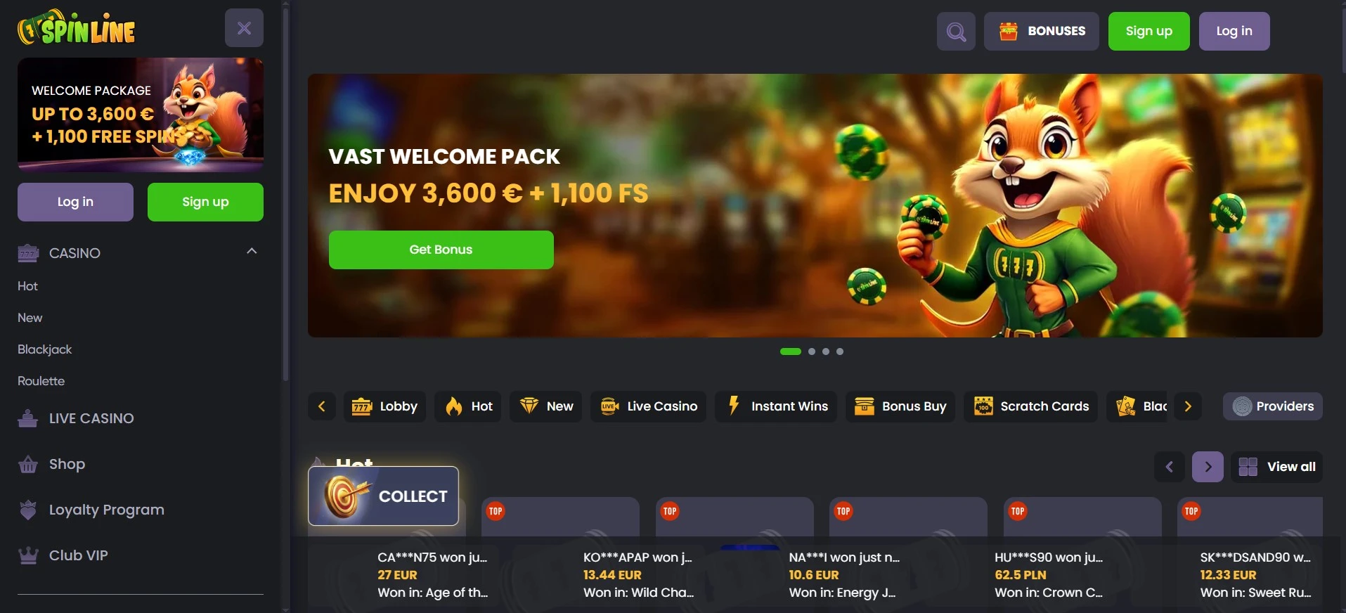 Languages available at Spinline Casino site are English, French, Finnish, Greek, Norwegian, Polish, Spanish, Danish, Portuguese, Slovenian, German, Hungarian, Italian.