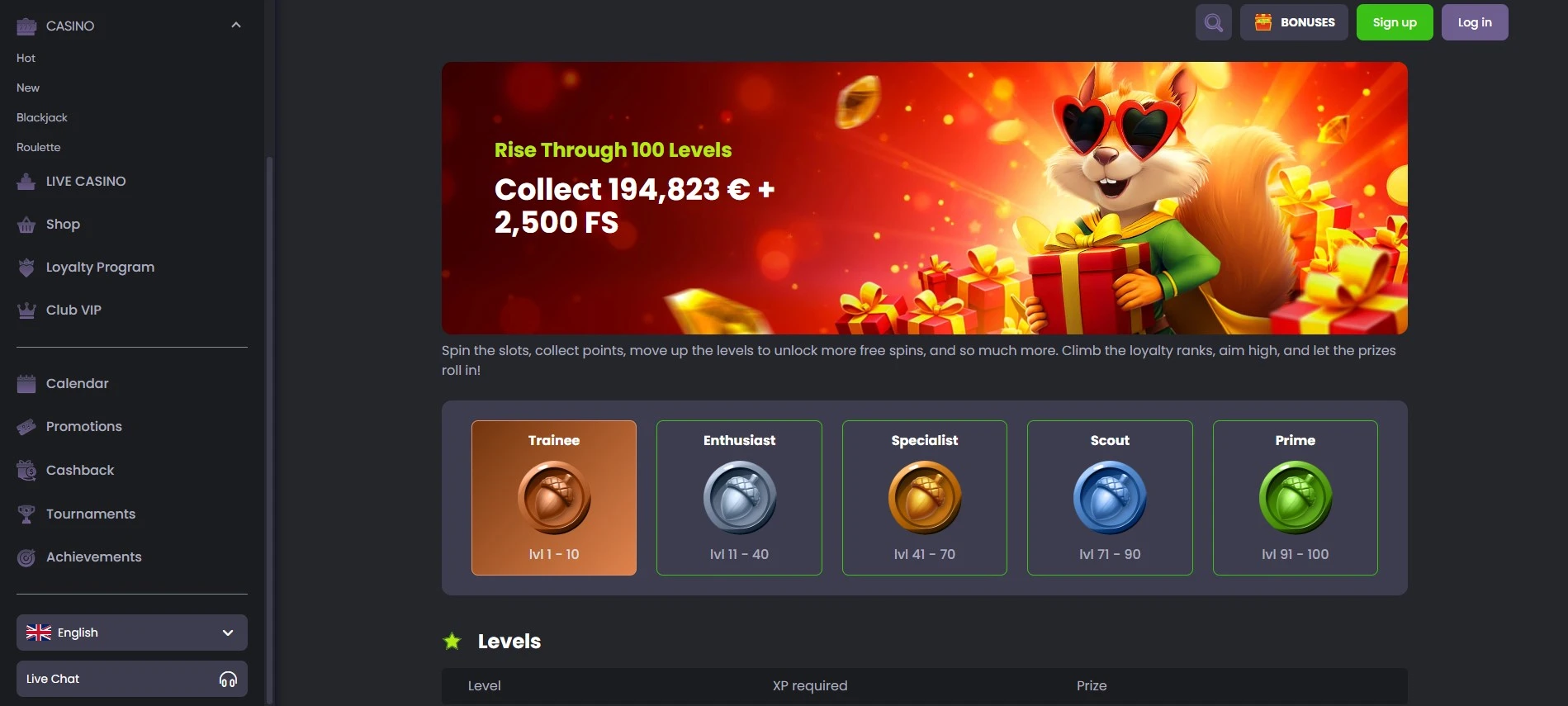 Věrnostní systém SpinLine Casino je rozdělen do pěti úrovní: Trainee, Enthusiast, Specialist, Scout a Prime. SpinLine kasino odměny rostou s postupem na vyšší úrovně a zahrnují vyšší míru cashbacku, exkluzivní bonusy a individuální VIP péči. Členové Prime získávají osobní podporu a nejštědřejší narozeninové dárky, což činí tento systém atraktivním pro české hráče usilující o dlouhodobé odměny.