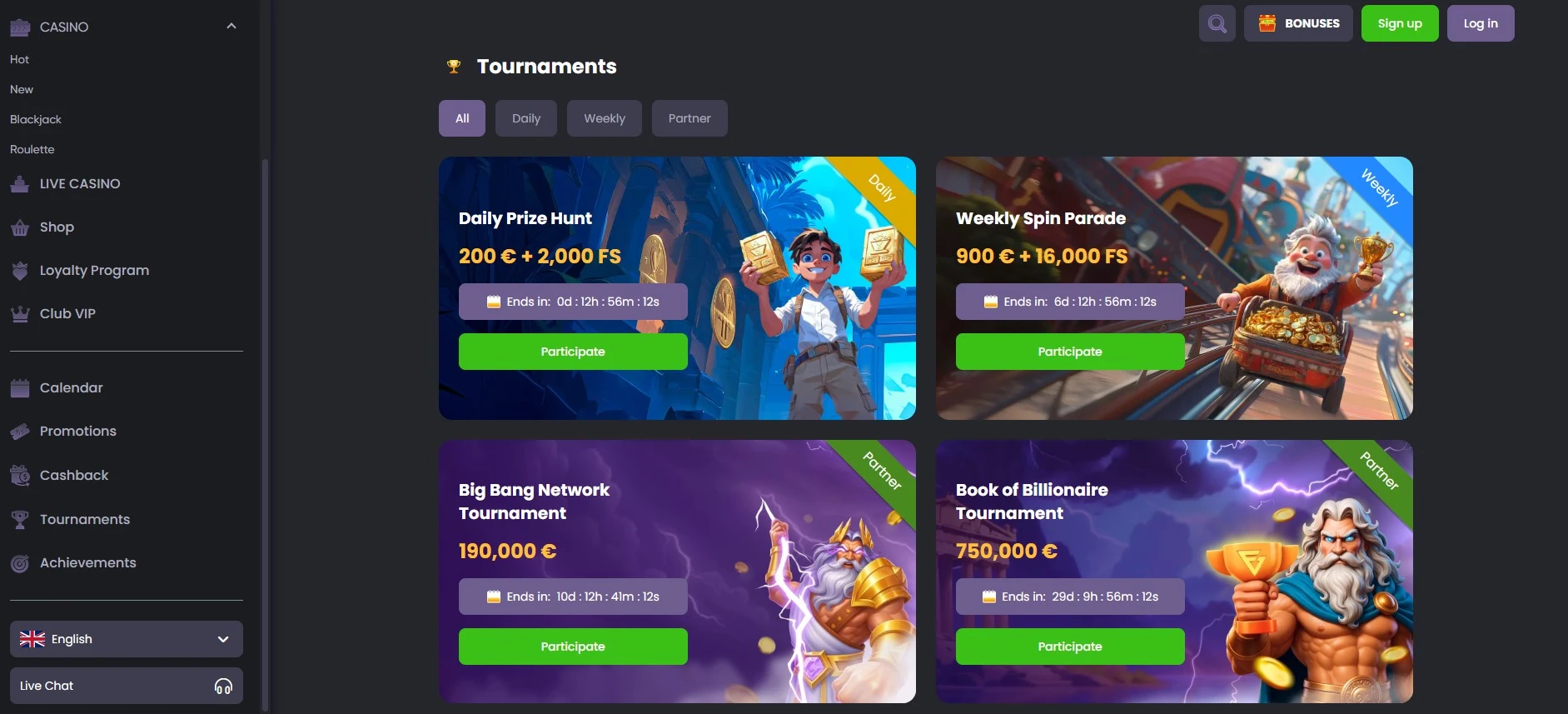 SpinLine kasino Česko také pořádá časté turnaje s obrovskými prize pooly. Mezi hlavní patří Daily Prize Hunt (200 € + 2 000 volných zatočení), Weekly Spin Parade (900 € + 16 000 volných zatočení) a síťové akce jako Big Bang Tournament s výhrami 190 000 € nebo Book of Billionaire Tournament nabízející 750 000 €. Tyto soutěže umožňují českým hráčům přidat do každodenní hry více vzrušení a zároveň usilovat o extra výhry.