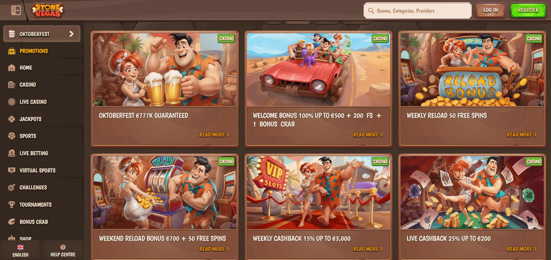 Noví členové kasina jsou přivítáni s 100% bonusem až do 500 €, k tomu získají 200 volných zatočení a přístup k exkluzivní funkci Bonus Crab. Volná zatočení jsou přidělována v menších dávkách, což umožňuje hráčům si je užívat postupně. StoneVegas kasino uvítací nabídka ale myslí i na sportovní fanoušky, kteří mohou získat 100% bonus k prvnímu vkladu až do 100 €, což jim poskytne extra prostředky na sázení na hlavní ligy a sportovní události.