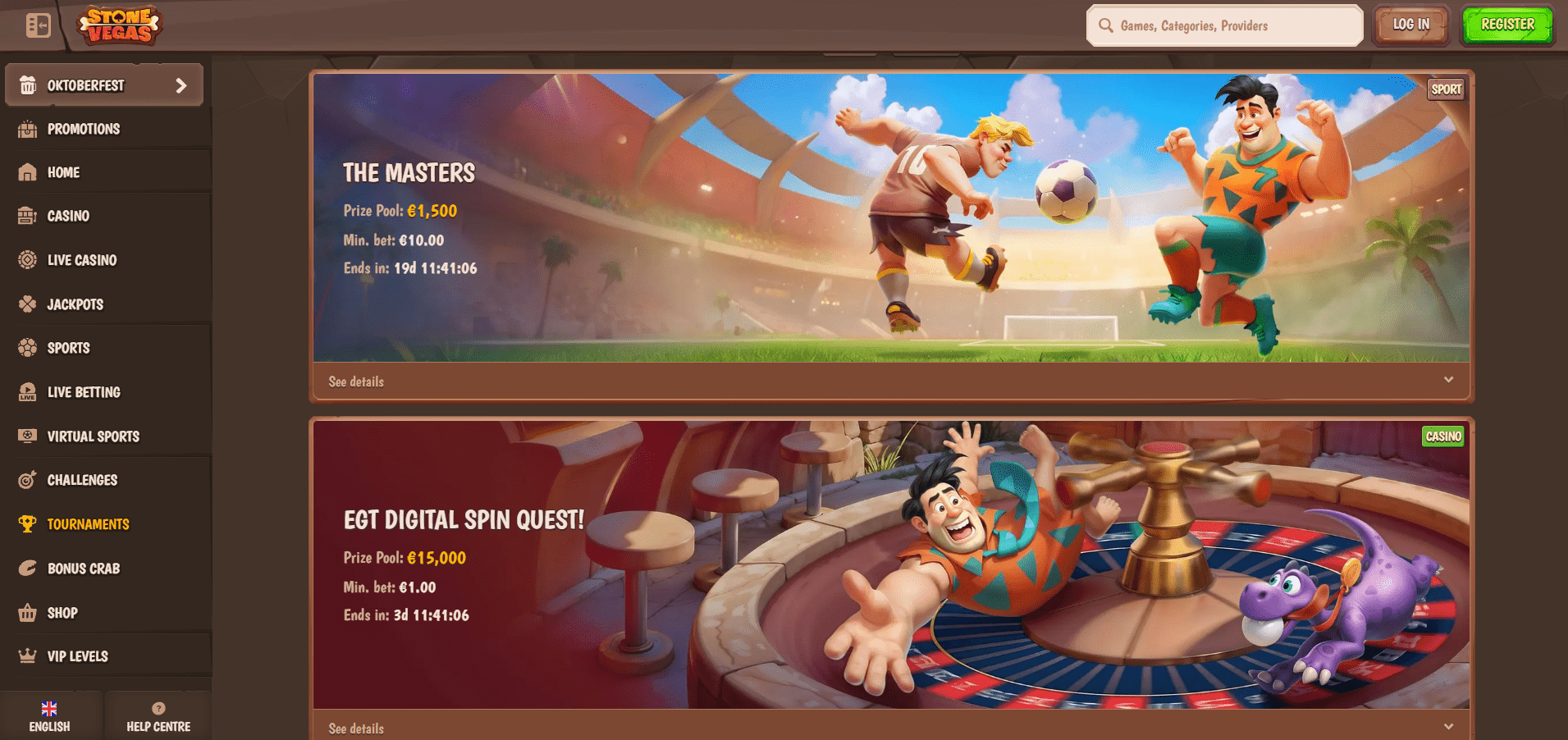 Soutěže jsou dalším velkým lákadlem StoneVegas. Akce jako turnaj s prize poolem 6 000 000 € nebo sezónní promo akce, například Oktoberfest, přinášejí výrazný soutěžní prvek. Sázením na vybrané hry hráči stoupají po žebříčcích a soutěží o odměny, mezi které patří peněžní výhry, volná zatočení a speciální bonusy.