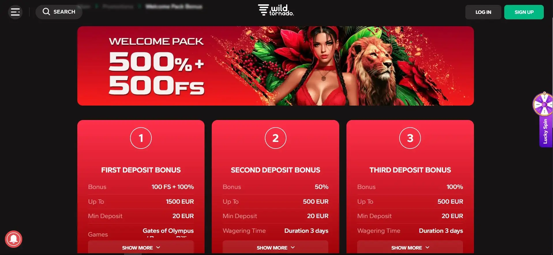 Wild Tornado Casino nabízí rozmanitou bonusovou sekci, která je určena jak pro nové, tak i pro stávající hráče. Čeští uživatelé mohou využít uvítací balíčky, reload bonusy, volná zatočení, cashback a věrnostní program. Většinu odměn lze aktivovat jak v EUR, tak i v kryptoměnách. Na webu CeskeOnlineCasina jsme podrobně prozkoumali seznam bonusů Wild Tornado casina, abychom hráčům ukázali, jak z nich vytěžit maximum.