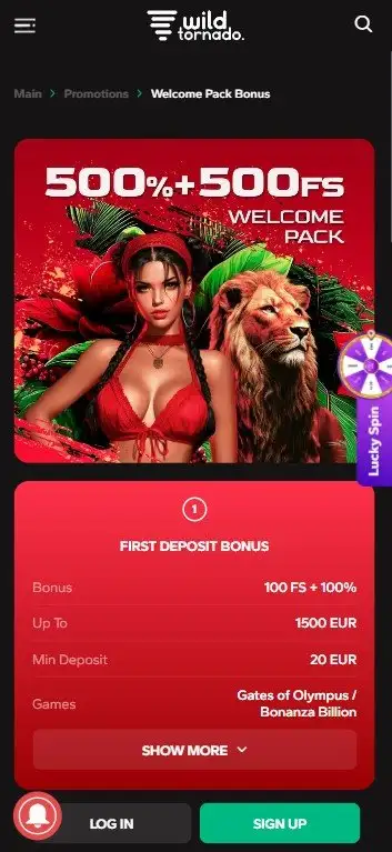 Noví hráči jsou přivítáni vícefázovou nabídkou, která může přinést až 500 % v bonusových penězích a 500 volných zatočení během prvních šesti vkladů: