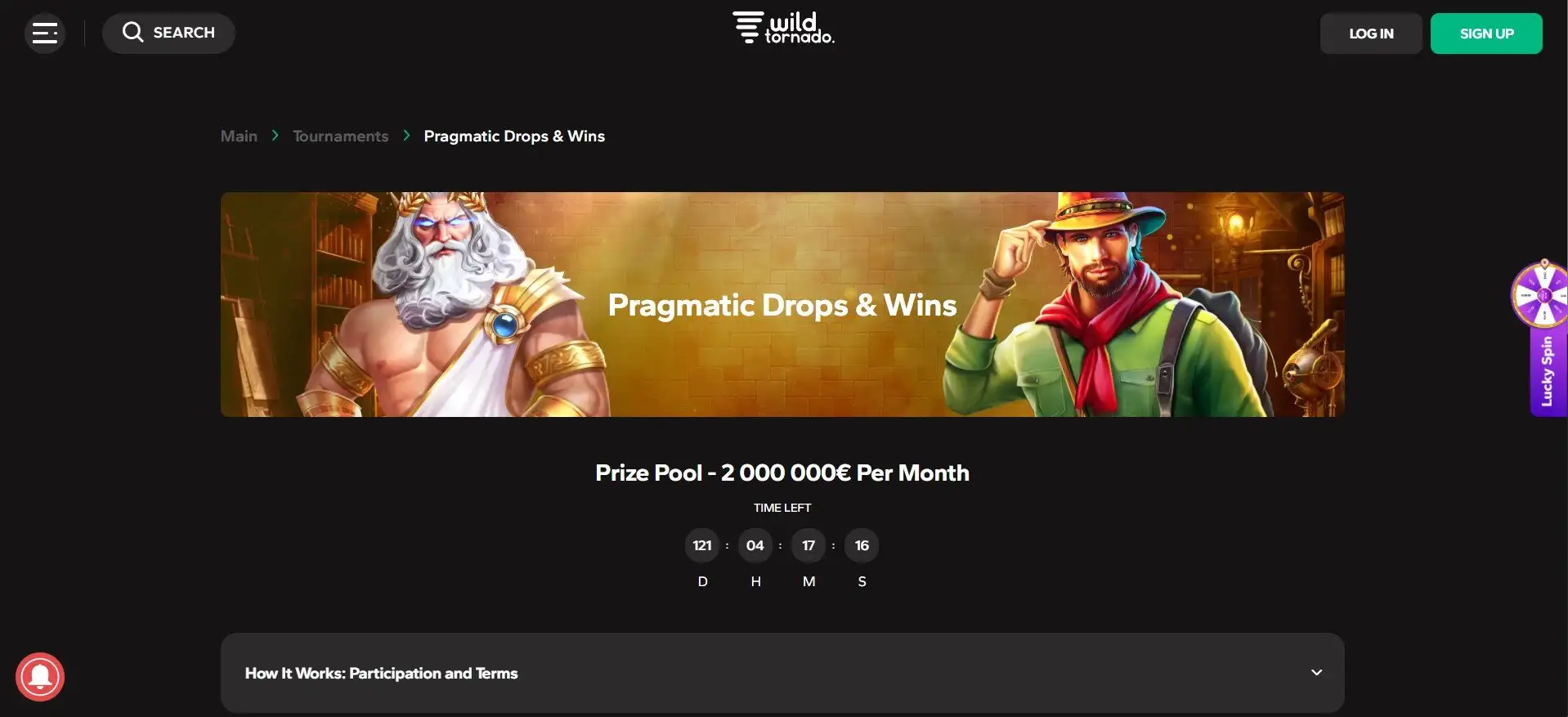 Wild Tornado pravidelně pořádá Pragmatic Drops & Wins turnaj, kde mohou hráči soutěžit o podíl z obrovského měsíčního prize poolu €2,000,000. Součástí akce je také Wild Tornado kasino bonus, který zvyšuje atraktivitu celého turnajového zážitku.