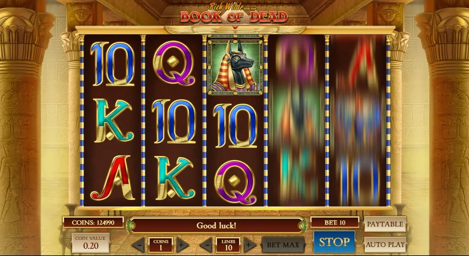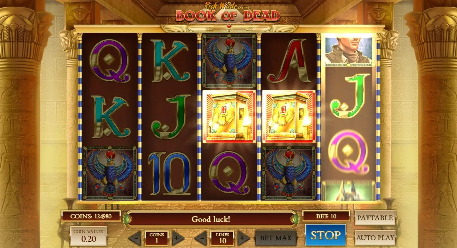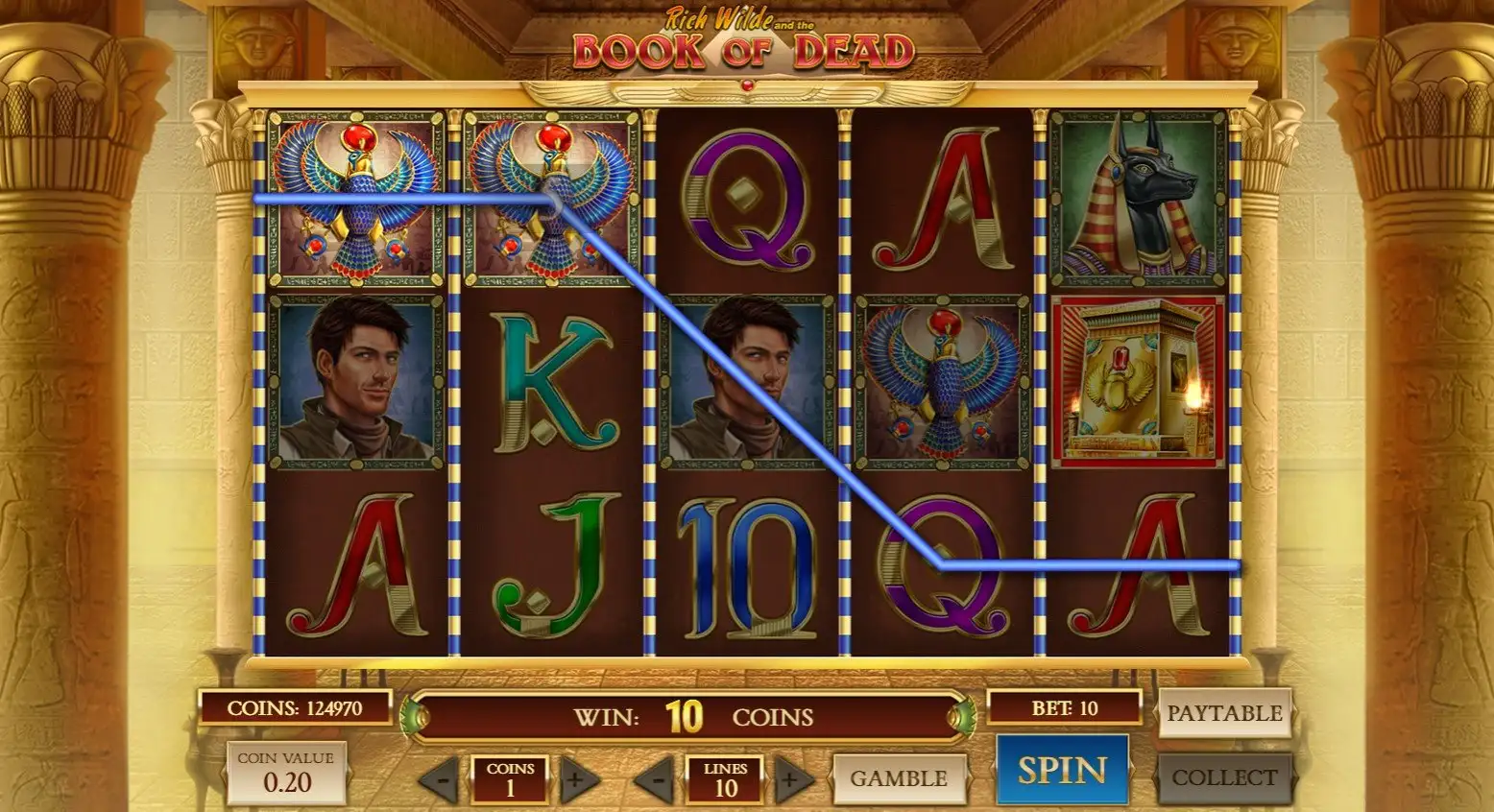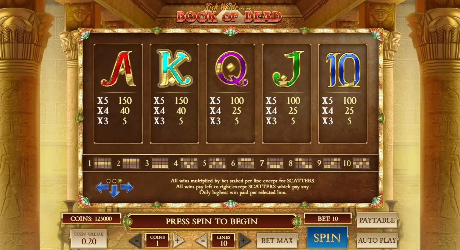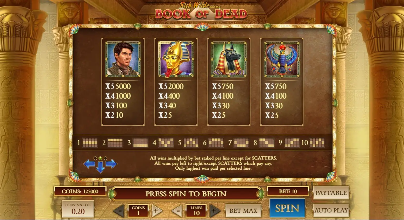 Book of Dead automat běží na klasickém rozložení 5x3 s 5 válci, 3 řadami a 10 výherními liniemi, které lze přizpůsobit vašemu stylu hry. Výhry vznikají, když se stejné symboly objeví na aktivních liniích zleva doprava, počínaje prvním válcem. Díky nastavitelnosti linií mohou hráči v Česku přesněji řídit úroveň rizika a upravovat strategii podle svého rozpočtu.