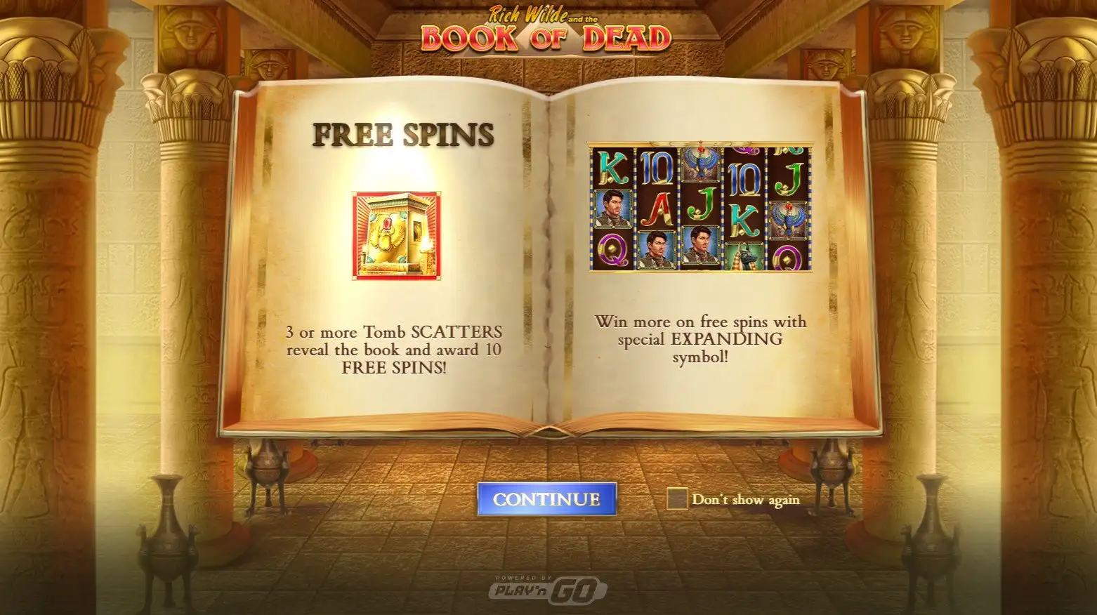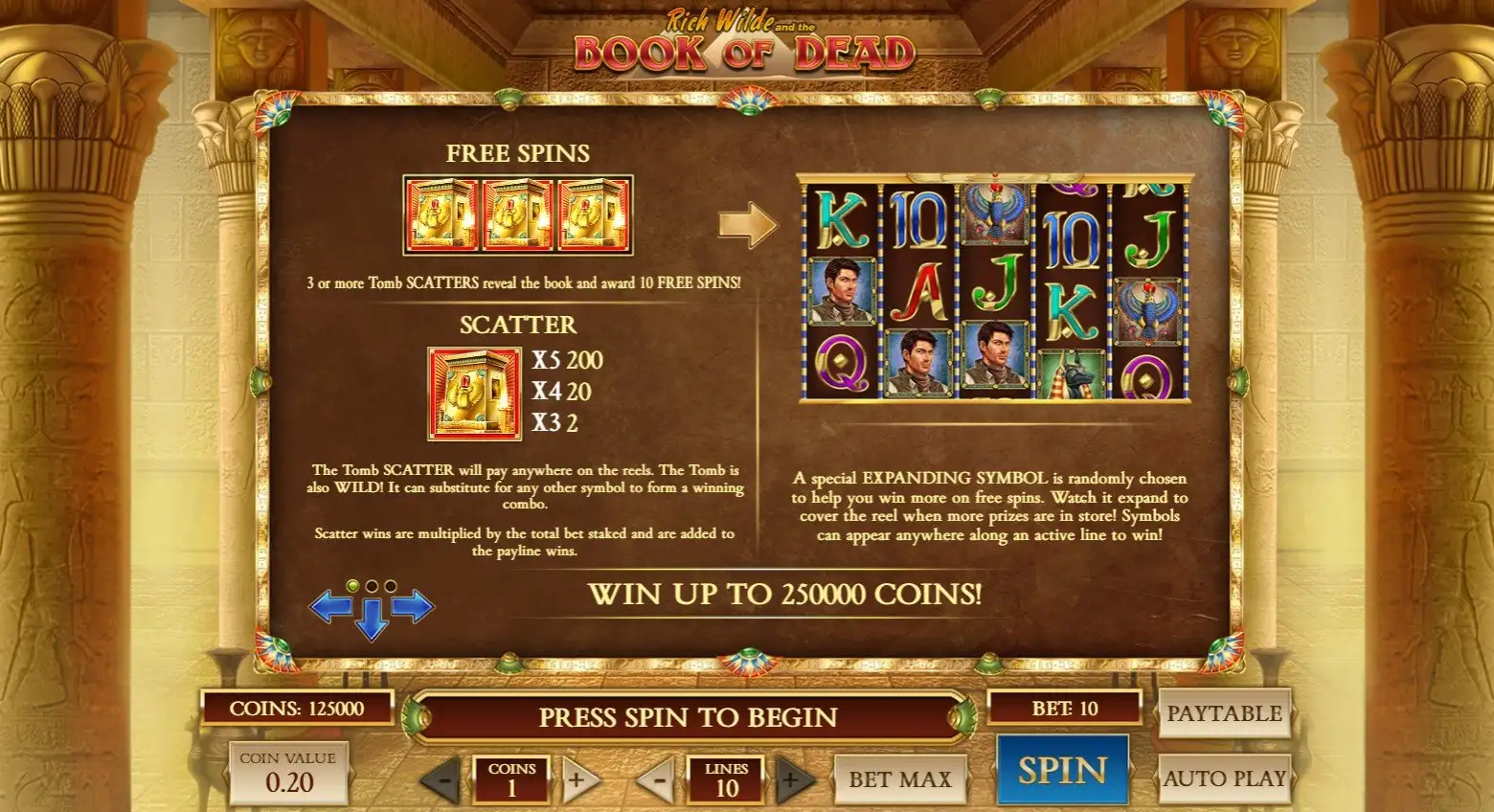 Než začnou volná zatočení, je náhodně vybrán jeden symbol, který se stane rozšiřujícím symbolem. Když tento symbol padne, může se roztáhnout a pokrýt celý válec — ale pouze v případě, že je možná výherní kombinace. Díky této funkci může Book of Dead hra přinést hráčům vysoké výplaty i v situacích, kdy symboly nejsou umístěny vedle sebe.