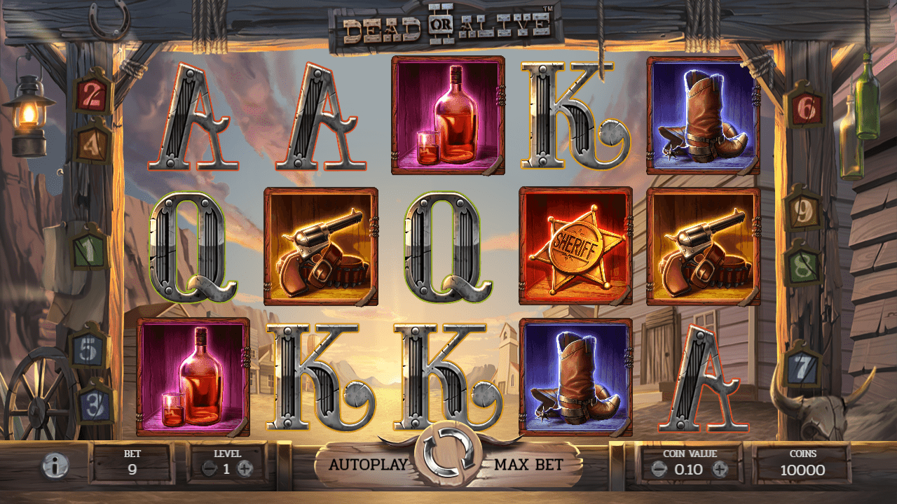 Herní symboly jsou rozděleny na nízké a vysoké hodnoty. Mezi nízko hodnotné ikony patří klasické karetní symboly od 10 po eso. Prémiové symboly, které odpovídají westernovému tématu, zahrnují kovbojské boty, klobouky, skleničky whisky, pistole a šerifské hvězdy. Nechybí ani speciální symboly, které přidávají hře ještě více napětí. Wild symboly jsou ztvárněny jako plakáty „Wanted“ s různými postavami a mohou nahrazovat jiné symboly ve výherních kombinacích. V bonusových kolech se mění na lepkavé (Sticky), což zvyšuje šanci na vyšší výhry. Scatter symboly – zobrazené jako zkřížené revolvery – jsou klíčem k odemknutí funkce volných zatočení, pokud se na válcích objeví alespoň třikrát, ať už se rozhodnete hrát Dead or Alive 2 zdarma nebo za reálné peníze.