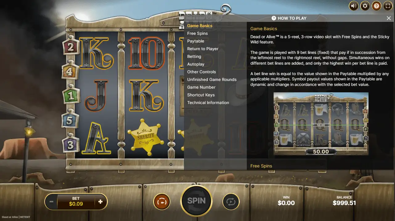 S jednoduchým rozložením 5 válců, 3 řad a 9 pevných výherních linií nabízí Dead or Alive snadno pochopitelnou hratelnost pro nováčky, ale zároveň dokáže zaujmout i zkušené hráče. Výhry se vyplácejí zleva doprava a při třech nebo více Scatter symbolech se spouští kolo volných zatočení s funkcí Sticky Wilds. Díky vysoké volatilitě se sice výhry neobjevují často, ale když přijdou, mohou být opravdu vysoké a přinášejí napínavou atmosféru, kterou si hráči v online kasino Dead or Alive užívají naplno.