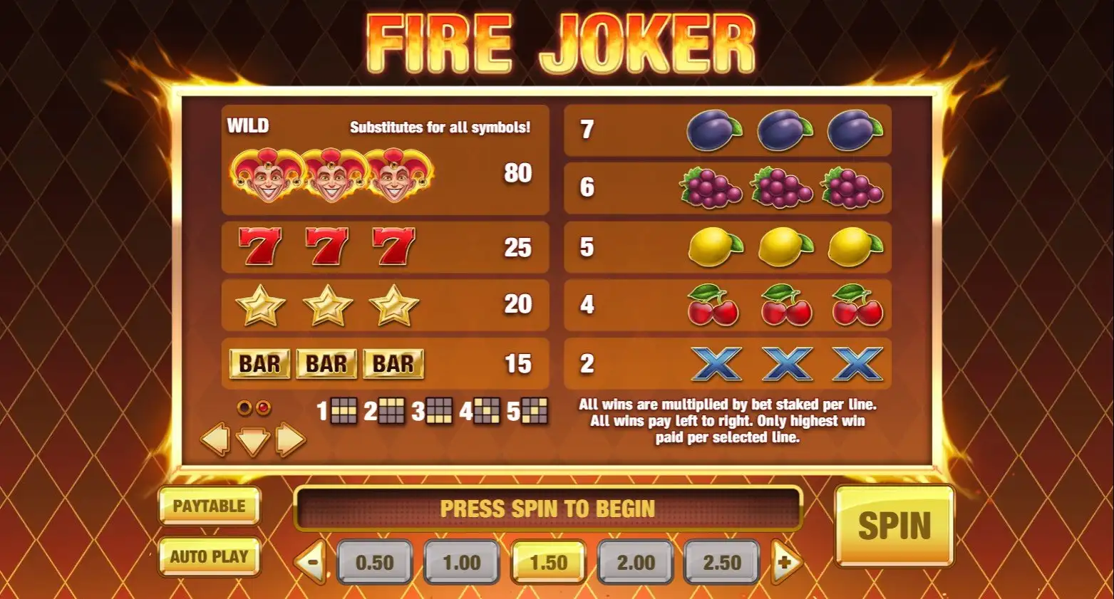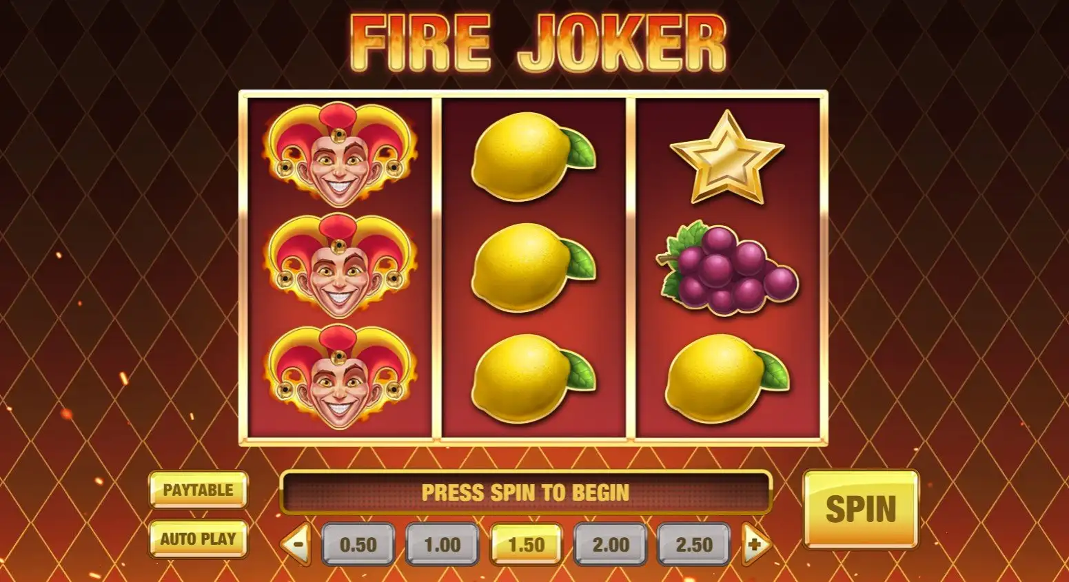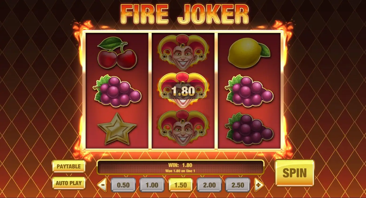 Fire Joker demo automat funguje na mřížce 3x3 s 5 pevnými výherními liniemi. Pro výhru musí hráči získat tři stejné symboly na jedné linii. Když se na dvou válcích objeví shodné symboly bez výhry, třetí válec se znovu roztočí a poskytne druhou šanci. Zaplnění všech devíti pozic stejným symbolem aktivuje kolo násobitelů, které nabízí až 10násobné zvýšení výhry. Wild symboly nahrazují jakékoli ikony, aby pomohly dokončit výherní linie.