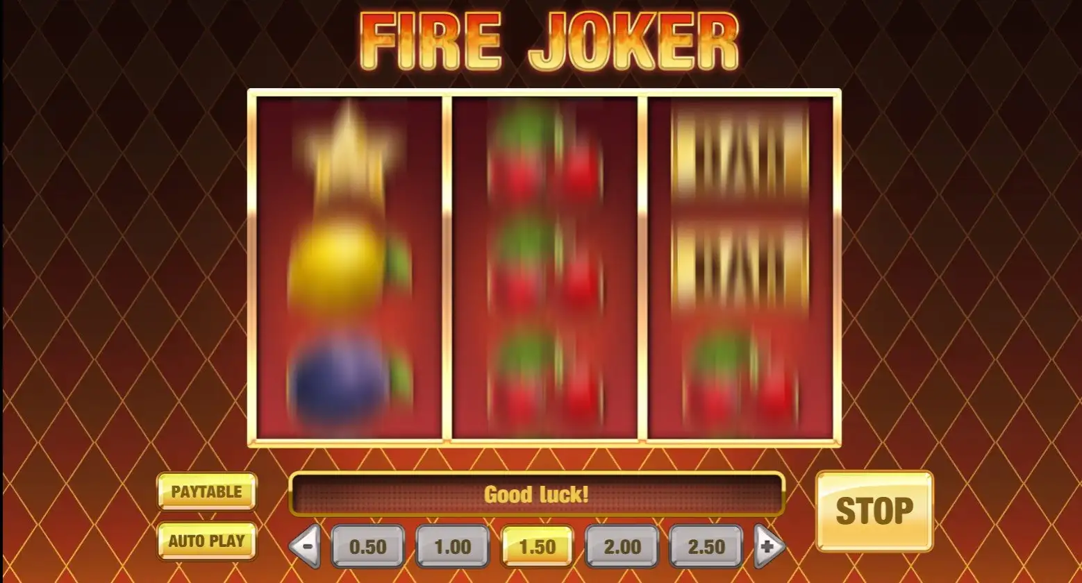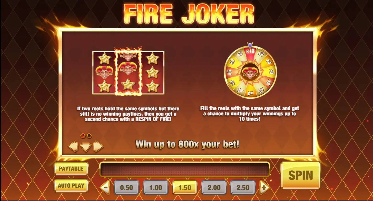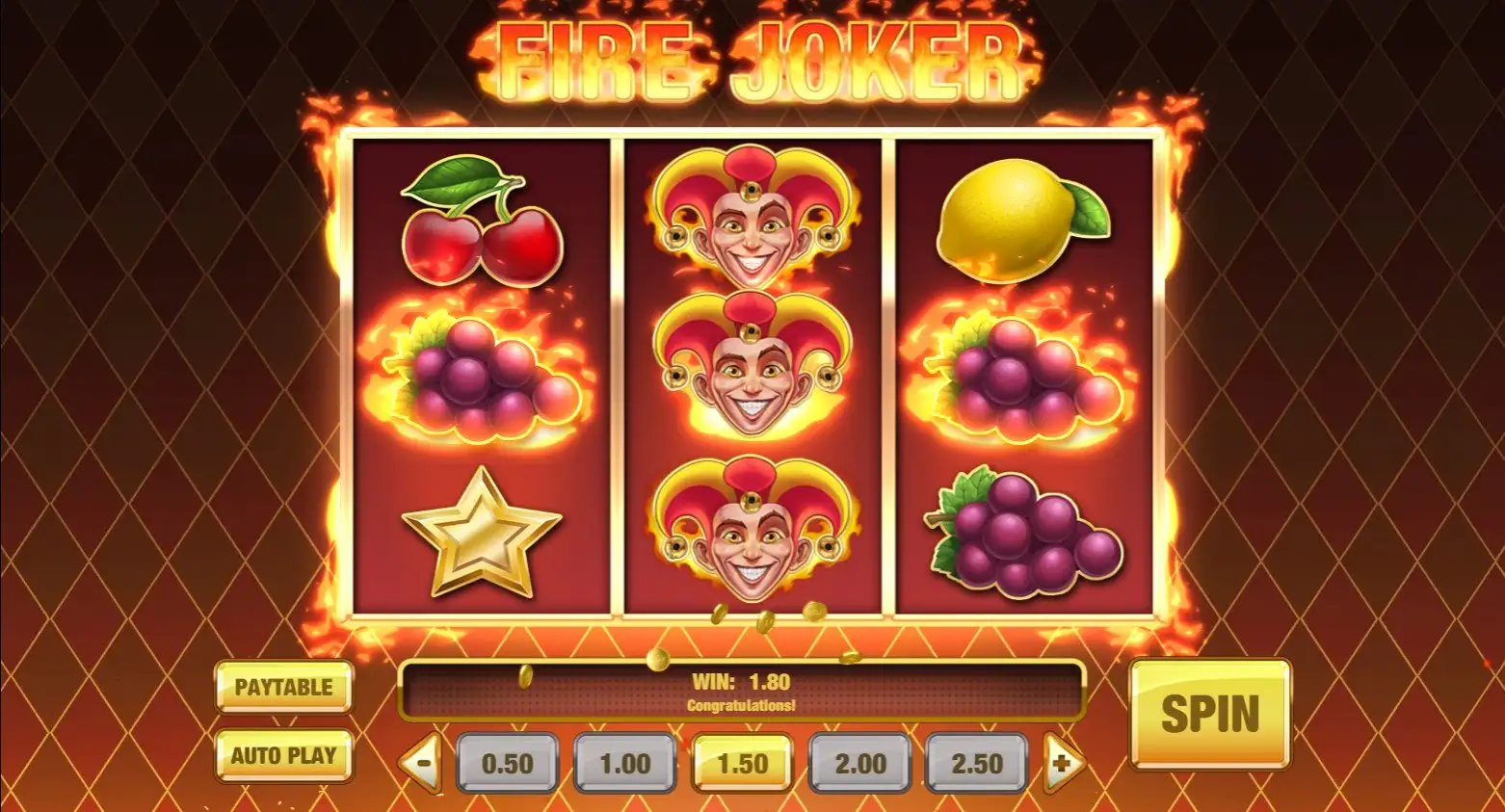 Fire Joker demo automat funguje na mřížce 3x3 s 5 pevnými výherními liniemi. Pro výhru musí hráči získat tři stejné symboly na jedné linii. Když se na dvou válcích objeví shodné symboly bez výhry, třetí válec se znovu roztočí a poskytne druhou šanci. Zaplnění všech devíti pozic stejným symbolem aktivuje kolo násobitelů, které nabízí až 10násobné zvýšení výhry. Wild symboly nahrazují jakékoli ikony, aby pomohly dokončit výherní linie.
